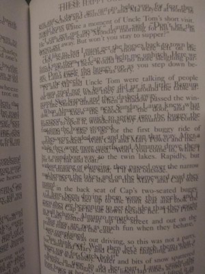 About 6-10 pages of this book are unreadable. The spacing of each line on these 6-10 pages is 0. This is ridiculous! This is why I do not like purchasing items online, I prefer buying items in person so I can check the items myself before purchasing. By purchasing online, I expect items to be checked and double checked before being shipped! I bought this book for my daughter to complete her collection of this beloved series.