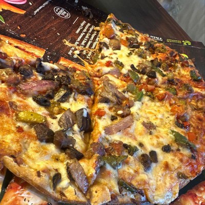 The pizza is bomb. Very flavorful for a frozen box pizza (I did sprinkle a little garlic powder). The instructions advise you to cook on 425 but I cooked on 400 for 12-13 mins and placed it directly on the rack and it turned out perfect. Everyone’s oven varies though. This might be the only frozen pizza I choose from now on.