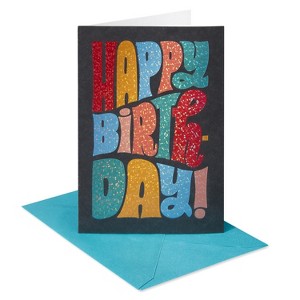 - This American Greetings Birthday card features a fun retro lettering 'Happy Birthday!' accented with glitter foil.