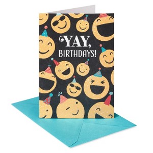 - This American Greetings Birthday card features smiley faces with party hats on accented with glitter foil.