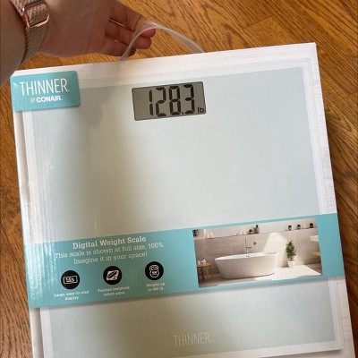 Measure and manage your weight with the Thinner® by Conair® Digital Weight Scale. Step onto the wide, comfortable platform to automatically engage the scale, and in moments, your weight appears on the large 1.4 in. (36 mm) LCD display. Measurements up to 400 lb. (182 kg) are calculated in 0.1 lb. (0.05 kg) increments, ideal for monitoring progress to support any weight-management program. The scale’s sophisticated design features a silver-colored tempered safety glass surface that gives it an elegant, contemporary look, elevating the aesthetic of any bedroom or bathroom. Its broad 11.8 in. x 11.8 in. (300 mm x 300 mm) platform and low 0.9 in. (23 mm) rise make it easy to operate—simply step on the scale to turn it on, stand in place, and in moments, your weight appears on the easy-to-read display screen. The scale’s low profile makes it compact and easy to store, too. The scale operates on 2 long-life AAA alkaline batteries (included), ensuring you won’t have to deal with frequent battery changes.