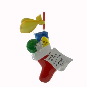 Make your holidays extra purr-fect with the Cat Stocking ornament from This Little Piggy! This whimsical 5.25-inch decoration features a playful red stocking brimming with yarn, catnip, and even a dash of kitty litter for charm that’ll make every cat lover grin. It’s topped with a red ribbon so it’s ready to hang anywhere that needs a touch of feline fun. Whether you're decking the halls or gifting to your favorite cat person, this quirky ornament adds personality and plenty of holiday cheer. Measures Approximately 5.25 In H X 3 In W X 0.75 In D (HxWxD). Includes 1 Ornament.