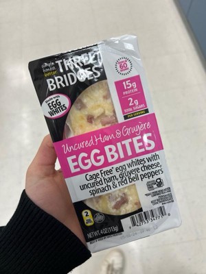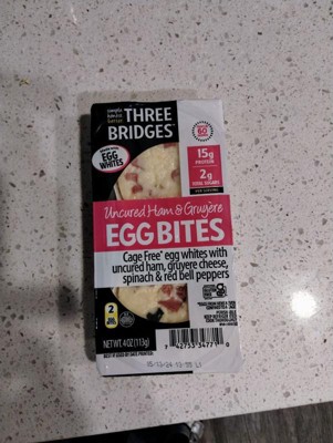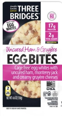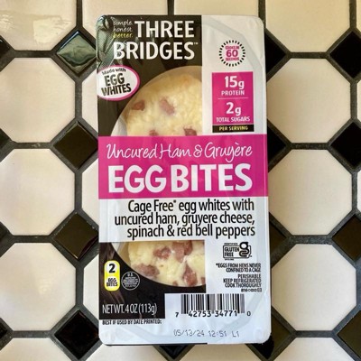 Creamy mini muffin shaped egg whites with ham and a gruyere cheese blend. These Three Bridges ham & Gruyere egg white bites transform a traditional breakfast! Packed in one convenient to- go -tray, the Three Bridges egg white bites provides a meal in a quick 60 seconds!