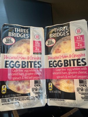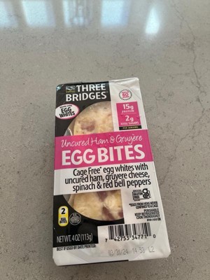 [This review was collected as part of a promotion.] I’m grateful to be reimbursed the cost of these Three Bridges Egg Bites in exchange for my review. The eggs were easy to warm in the microwave, tasted perfectly cooked, and were full of the most delicious cheesy flavor. The egg texture was creamy and smooth and the ham and gruyere cheese was the perfect flavor combination. I think it would be even better without the spinach and peppers, but that's just my taste preference and I'm sure a lot of people will like it better with the addition of the veggies.