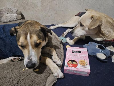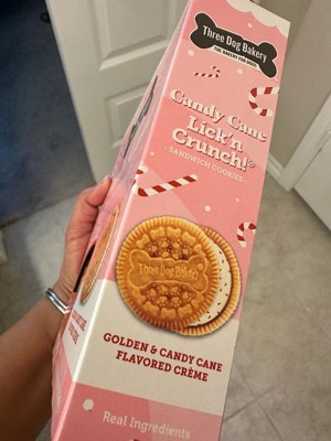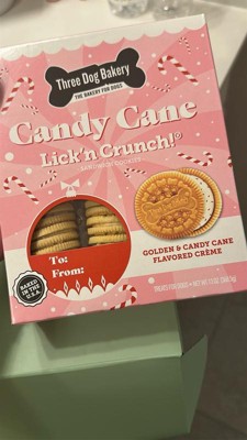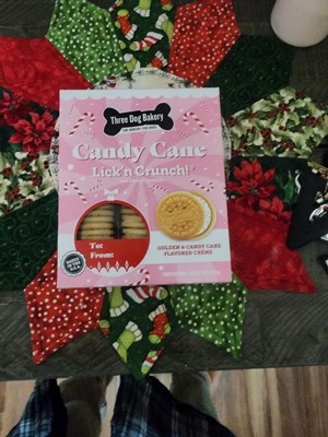 [This review was collected as part of a promotion.] My dogs absolutely love these great treats from Three Dog Bakery. I wasnt sure if they would like the candy cane lick and crunch flavor, so I was shocked when they not only liked, but love them. They are the perfect sized treat, and easy for them to chew. The packaging is like like a pack of trees in a box! They jave stayed fresh and come qith 3 rows of cookie treats. I would indeed recommend these for your dogs.