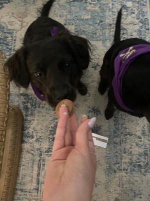 [This review was collected as part of a promotion.] The ingredients seem healthy as I looked them up. Feels like a regular cookie. Had to break it up for my Chihuahua since she has a small mouth. The packaging was cute. The cookies smell good. And they did the job. Dog loved it