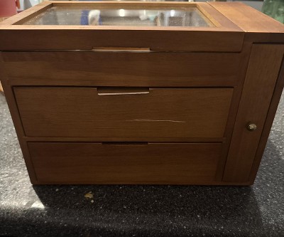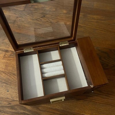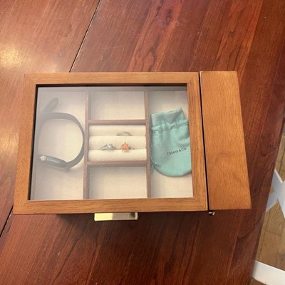 A: The jewelry organizer is made from rubberwood, known for its durability and attractive finish.