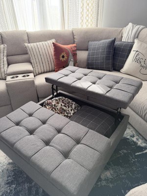 [This review was collected as part of a promotion.] This ottoman is beautiful. It is the perfect size to add storage and a place to kick your feet up with our sectional. The lift top feature is amazing. Dual work from home? One person in the living room with a work station made by the ottoman. Relaxing casual “tv dinner” surface for the couch seating. My kids even think it’s super cool and love discovering new blankets I’ve stashed inside this super functional piece. Set up was simple out of the box. We are so pleased with this accent piece for storage, function, and simple beauty.