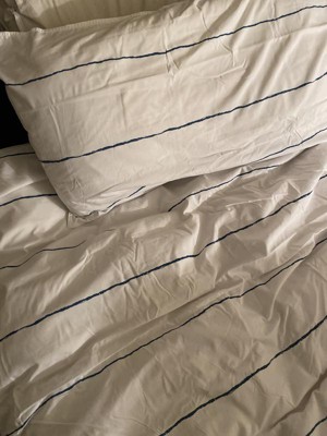 Inspired by the outlines left by the rising and receding tides, the City Scene Tideline duvet cover set achieves a level of simplicity and sophistication that is perfect for any bedroom. The thin painterly blue stripe design on the soft white ground is classic enough to be used on its own but versatile enough to be a layering piece that fits with a wide range of styles. The cozy microfiber construction leaves a soft hand that is perfect for any season. Duvet cover features a zipper closure and additional inner corner ties which ensure that the duvet stays in place during use. Duvet insert is not included. Set is machine washable for easy care. Twin duvet set includes: One Duvet cover 68"L X 88"W and one standard sham 21"L X 27"W. Full/Queen Duvet set includes: One duvet cover 88"L X 88"W and two shams 21"L X 27"W. King Duvet set includes: One duvet cover 104"L X 88"W and two shams 21"L X 37"W.