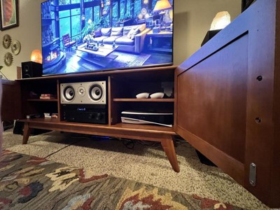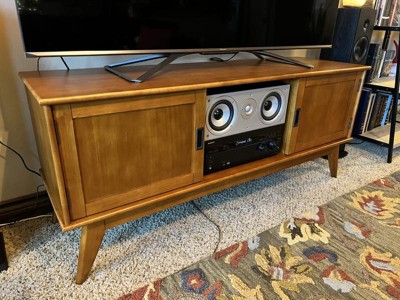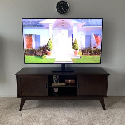 A: Dear customer, Thank you for inquiring about our Simpli Home Draper Mid Century Low TV Media Stand. We would like to inform you that the width of the tv media stand is 60" Inches and TV Stand is perfect for TVs up to 65 inches. Please feel free to write us if further information about this product is needed. Thanks again
