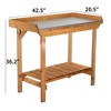 This Gardener's table is perfect for potting plants and transplanting seedlings. Crafted in Europe from pine and spruce wood sourced from FSC-certified forests committed to environmental responsibility, it features a treatment for protection against rot and decay. The table includes a tin work surface for extra durability and a lower shelf for tool and planting accessory storage. Dimensions are 42.5"L x 20.5"W x 36.2"H, weighing 38 lbs. with a capacity of 110 lbs. Packaging dimensions: 44" x 21" x 6". Assembly is required; the table comes without predrilled holes, necessitating drilling by the purchaser.
