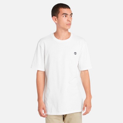 A classic tee is a must-have for every wardrobe. This men's T-shirt is made with 100% cotton fabric for comfort and lasting durability. The regular fit gently skims the body so you can wear it on its own or layered up. The bold Timberland logo on the chest makes a stylish statement.