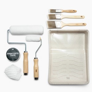 The TINKR Painting Kit offers all the essentials to tackle painting projects with ease and confidence. Whether you're refreshing a room or touching up baseboards, this complete set includes a large roller, small roller, two roller covers, three angled brushes (½", 1", 2"), painter’s tape, a dust mask, and a biodegradable tray with a reusable liner. The wood handles provide a steady, comfortable grip, while the varied roller sizes and angled brushes make both coverage and detailing simple. Designed with an eye for clean lines and a cleaner planet, this kit brings practical tools and smart design together in one approachable set.