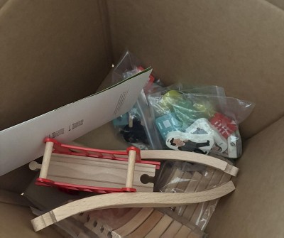 - Wooden train track set includes 39 carefully selected pieces, such as trains, tracks, traffic signs, and more.