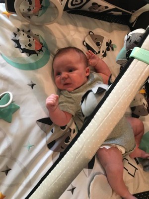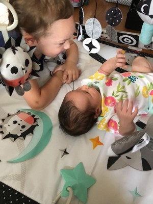 My little girl loves this gym! The contrasting black and white scheme definitely catches her eye more than the colorful alternative we have at home without the use of flashing lights in her face.