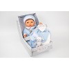 - Doll is dressed in a blue one-piece garment with a lamb applique and cute cap.