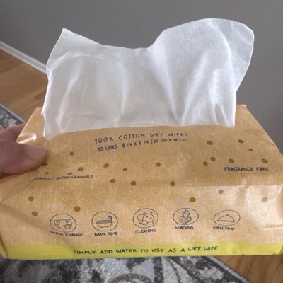 [This review was collected as part of a promotion.] These wipes are multipurpose and they are dry but can be used as a wet wipe with the addition of a little water as needed. We use these for all types of things such as cleaning the high chair, wiping dirty noses, and diaper changes. Sometimes we will wet them individually or you can also open the package and let a light stream of water from a faucet wet the entire pack. These are sturdy and versatile, yet soft on skin.