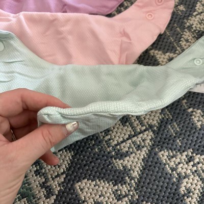 [This review was collected as part of a promotion.] Bibs are essential for teething babies and this pack of bibs are perfect! Great colors in this set of 6 for baby girl. The bibs are much thicker than your standard bibs and can soak up all the drool which is wonderful because there is a lot of this. I like the snap closure which offer two different sizes so it can grow with baby. My baby is just over a year and can comfortably wear it at either size spot I received an incentive to write this review.