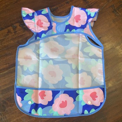 [This review was collected as part of a promotion.] This bib is adorable. There’s so many patterns, it was hard to choose one, but the butterflies are really cute. The pattern doesn’t line up with the ruffled sleeves but that didn’t bother me. It’s a little tricky to put on a baby because you have to get that arms through the arm holes, but that provides more coverage for an eating baby! This size small( 6-24 months) fit my 8 month old well with room to grow. The ruffled sleeves are really cute for a baby girl. The Velcro was easy to attach and detach. It has a little pocket to catch food in the front and it’s easily washable . I received an incentive to write this review.