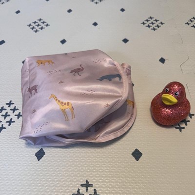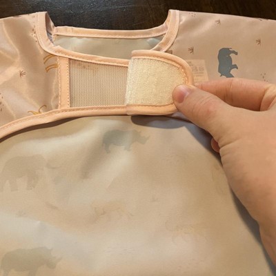 [This review was collected as part of a promotion.] This is a cute large sleeved bib for a little girl. I like the muted pink color and the realistic safari animals. The bib has a bit of a sheen to it. It has the little branded label on the flap and heavy-duty Velcro for the closure. My daughter loves animals and all things pink so she was dying to try it on. She wore it around the house until mealtime so it must be comfortable. It provides very good coverage for whatever she is wearing underneath so I am pleased with the purchase. She is almost 3 and I ordered the large 2-4 size. It should still fit her for a while so that is great! I received an incentive to write this review.