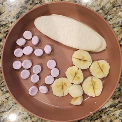 [This review was collected as part of a promotion.] These little plates are adorable and sturdy. I think the size is just right for a toddler. They fit in my dishwasher well alongside my other plates, even with the defined lip along the edge. I like the three pretty colors in the pack of purple and pink I selected. They match the long sleeved bibs that my daughter uses from Tiny Twinkle. They do not have any non-skid features on the bottom so you do have to watch your toddler carefully to ensure they don’t shove the plate off the table. I received an incentive to write this review.