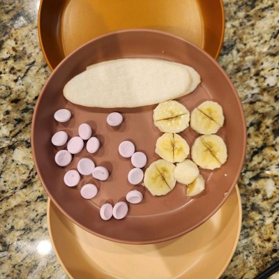 [This review was collected as part of a promotion.] These are the perfect plates for my toddler to use during mealtime. They come in fun colors and my daughter loves getting to choose which one she uses for that meal. I bought the matching bowls and the suction plates to have a full set. I love that they are BPA-free, lightweight, and easy to clean. We even tried a very oily pasta sauce, and the sauce did not stain the plate. I also love that they are from a family-run company. I received an incentive to write this review.