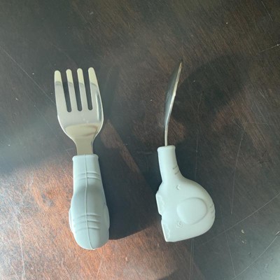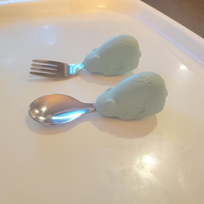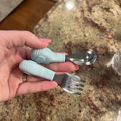 [This review was collected as part of a promotion.] I ordered the stainless steel fork, and spoon set for my toddler. I like that the fork and spoon both have stainless steel heads and the handle of the silverware is a wide silicone handle in the shape of bears. I ordered the sage color, but the bears seem to be a little more on the blue side, but I still like the color. I like that the handles are easy to grip and wide enough for toddler hands to be able to grasp them easily. The handles feel soft but not squishy and they seem very durable and easy for kids to use. Overall, I am very satisfied with my purchase. I received an incentive to write this review.