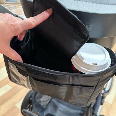 [This review was collected as part of a promotion.] I was very excited to try out my new stroller organizer when it came in the mail. It is a nice rich, black tone and blends in with the stroller. It has a pretty big compartment to hold things. The material is plastic key, though which I was not expecting, but I guess the coffee spills would be easy to wipe off if that happens the drink sides hold a large cup of coffee, but a smaller one would probably be too short and it also holds a water bottle great