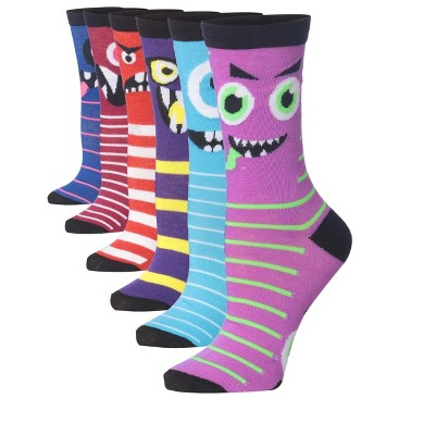 Tipi Toe Women's 6 Pack Colorful Striped Monster Smiles Patterned Lightweight Crew Socks