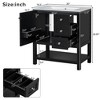 Crafted with solid wood and MDF construction, this multifunctional vanity features:- 30"W transitional design with black matte finish- Integrated ceramic sink (30"W¡Ã18.3"D¡Ã6.7"H)- 250lb weight capacity with 92.15lb assembly weight- Soft-close hinges and drawer glides- 1-door cabinet + 2-tier drawer storage system- Waterproof surface for humid environments