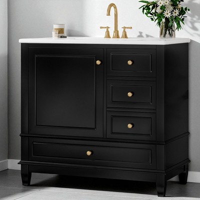 Upgrade your bathroom with this 36" modern vanity in a crisp white finish, paired with a durable ceramic sink. Designed for both style and functionality, it features 3 drawers, an adjustable shelf, and spacious under-sink storage to keep your essentials organized. Soft-close doors ensure a quiet and smooth experience, while high-quality materials provide long-lasting durability. Perfect for medium to small bathrooms, this vanity enhances your space with elegance and efficiency.