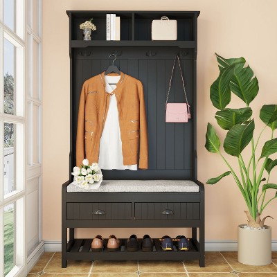 TiramisuBest 4-in-1 Farmhouse Hall Tree with Wood Bench, 2 Drawers & 6 Hooks - Entryway Organizer for Hallway/Living Room Black, 55.9"x75.6"