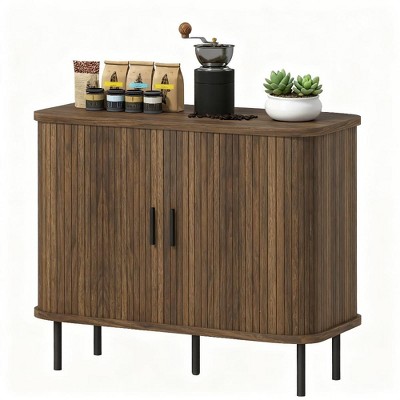Upgrade your home with the 40" Storage Cabinet, a stunning blend of modern design and practical functionality. Featuring accordion-style tambour sliding doors, this cabinet offers a sleek, space-saving solution with its unique oval silhouette and warm wood grain finish. The slatted roll-up doors and vertical handles add a contemporary touch while ensuring effortless opening and closing. Designed for versatility, this piece is perfect for multiple uses, whether in your kitchen, living room, entryway, or office. Use it as a sideboard, TV stand, bookshelf, or even a coffee bar console,it adapts to whatever your home needs. The spacious flat countertop and four independent compartments provide ample storage, while the adjustable shelves allow for customization to fit items of all shapes and sizes. Crafted from high-quality wood, this sideboard buffet cabinet is built to last, resisting cracking and warping over time. The elevated leg design not only gives it a sleek, airy appearance but also makes it easy for your robot vacuum to glide underneath for effortless cleaning. Whether you¡¯re looking for stylish storage solutions or a modern accent piece for your space, the TiramisuBest 40" Storage Cabinet is the ideal choice. It combines elegance, functionality, and durability in one perfect package.