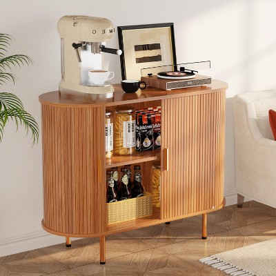 Upgrade your home with the 40" Storage Cabinet, a stunning blend of modern design and practical functionality. Featuring accordion-style tambour sliding doors, this cabinet offers a sleek, space-saving solution with its unique oval silhouette and warm wood grain finish. The slatted roll-up doors and vertical handles add a contemporary touch while ensuring effortless opening and closing. Designed for versatility, this piece is perfect for multiple uses, whether in your kitchen, living room, entryway, or office. Use it as a sideboard, TV stand, bookshelf, or even a coffee bar console,it adapts to whatever your home needs. The spacious flat countertop and four independent compartments provide ample storage, while the adjustable shelves allow for customization to fit items of all shapes and sizes. Crafted from high-quality wood, this sideboard buffet cabinet is built to last, resisting cracking and warping over time. The elevated leg design not only gives it a sleek, airy appearance but also makes it easy for your robot vacuum to glide underneath for effortless cleaning. Whether you¡¯re looking for stylish storage solutions or a modern accent piece for your space, the TiramisuBest 40" Storage Cabinet is the ideal choice. It combines elegance, functionality, and durability in one perfect package.