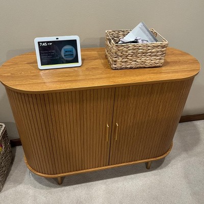- Unique Design: This storage cabinet features accordion-style wooden doors with warm wood grain. Its distinctive oval silhouette energizes the space, showcasing a sleek texture. The slatted roll-up sliding doors paired with wooden handles blend modern style with spatial efficiency while minimizing collision risks. Vertical door handles enable effortless opening and closing. Highly versatile and visually appealing, it allows endless possibilities to fill your home with imagination
