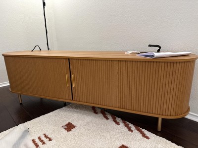 Elegant Fluted TV Stand:Featuring accordion-style wooden doors with a natural warm wood grain, this media cabinet showcases a distinctive oval silhouette that adds dynamic elegance to any room. The sleek, slatted roll-up doors slide smoothly on tracks, combining modern aesthetics with space-saving efficiency. Wooden handles and vertical grip bars ensure effortless operation while reducing the risk of collision