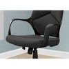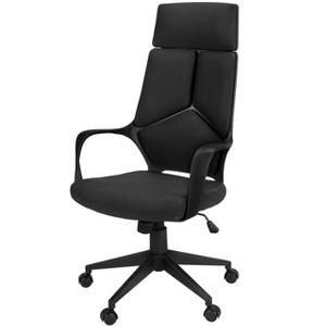 High-back executive office chair with fixed armrests in black and soft, polyester fabric in blackSupportive, tall backrest with an integrated headrest features padding that is segmented to deliver targeted softness, and the generously padded seat is thick, deep, and extra wide to provide outstanding comfort360-degree swivel seat and black 5-star base with hooded casters offer mobility, while an adjustable height mechanism with tilt-back/lock-in control allows the chair to be optimized for the sitterConforms to BIFMA standards for office furnitureAssembly required: Illustrated instructions and all hardware are provided for convenience (additional tools may be needed); this desk chair measures 25 inches L x 24.5 inches W x 45.75 inches H