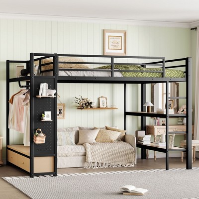 TIRAMISUBEST Full/Queen Size Loft Bed with Desk and Drawers, Metal Bed Frame with Storage Shelves and Clothes Rod