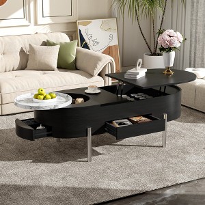 This oval shaped lift-top coffee table is a versatile addition to any home. With its hydraulic lift system, hidden storage, rotating tray, and sleek design, this table provides both beauty and practicality in one.