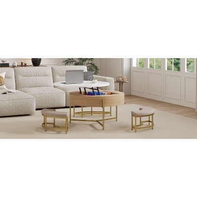 TIRAMISUBEST Modern Round Lift-Top Coffee Table, Center Table with Hidden Storage & 3 Nesting Ottomans