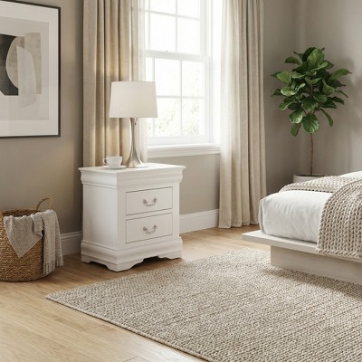 This sleek white nightstand blends contemporary design with smart functionality, featuring two roomy drawers (14"W x 13"D x 5"H) with smooth metal glides and durable French dovetail construction for effortless organization. The brushed nickel handles add refined contrast to the minimalist silhouette, while the sturdy engineered wood build ensures lasting quality.