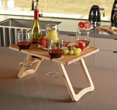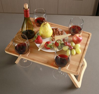 Tirrinia Natural Bamboo Wine Picnic Table, Folding Portable Outdoor Snack & Cheese Tray for Concerts at Park or Party, Beach, Summer Camping
