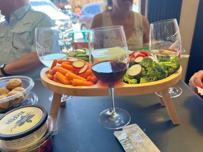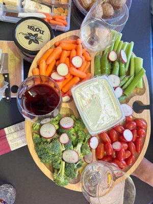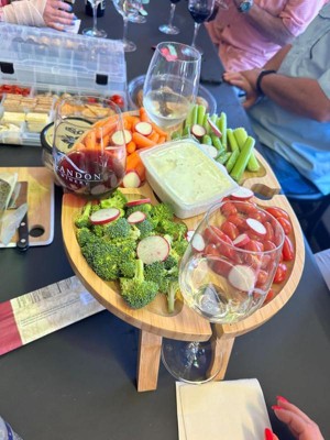 I seriously don’t have a bad word to say about this! It’s great for a small get together or wine tasting, has just the right amount of space for veggies etc. and the four wine holders is a nice touch too. The table legs collapse easily (fold up) for storage and stay closed with the aid of a few magnets. It’s easy to clean and has a nice finish to the wood. Every time to take this somewhere and use it everyone asks where we got it and wants one. Now that’s a good testament to a product. Will use this for as long as we can, great product.