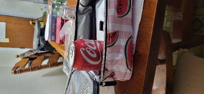 Pictures are misleading, there is no way a can of coke fits upright in this bad. Impossible to close.
