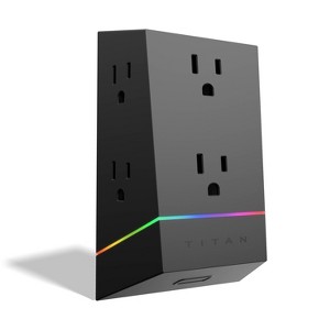 Shield your most valuable electronics with the Titan Surge Protector Tap with Multicolor LED. Featuring six grounded and protected, three-prong outlets, this impressive surge protector will safeguard your connected equipment from harmful voltage spikes with a surge protection rating of 560 Joules. The outlets on this unit are also adapter-spaced to allow extra room for those bulky plugs and charging adapters. Easily power the newest electronics and mobile devices with the grounded AC outlets. Just plug the surge protector into a standard grounded duplex wall receptacle, and you’re ready to go. The unit adds versatility to your electrical outlets by incorporating a unique vertical, side-access design. The unique angular design of the wall tap is the perfect addition to any gaming setup, making your wall tap stand out instead of needing to be hidden. Use the capacitive touch button to personalize your outlet extender by selecting one of the many colorful LED light options or set it to cycle through the full spectrum of hues. The Titan 6-Outlet Surge Protector Wall Tap with Multicolor LED is the perfect way to empower the player.