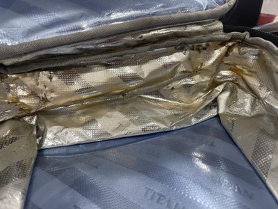 Hello Mom23, Thank you for your review. We are sorry to hear of your experience and this is not what our customers experience with our products. This particular item contains SuperFoam® insulation and Therma-Flect® radiant barrier provide superior cooling to keep food fridge cold (4.4°C/40°F) up to 6 hours**! The interior also includes a leak proof***, easy clean lining with Microban®**** to help protect against bacterial odors and stains. While our team was assessing the photo they noticed that when zoomed in, there appears to be multiple puncture holes and tears from a sharp object or corner of an object that is visible within the lining. Damage like that will impact the integrity of the product and allow the possibility of moisture to leak into spots not intended or not protected by the Microban lining. If you have any more concerns or questions please do not hesitate to contact us directly at service@ca-innovations.com