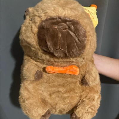 This capybara is soft and snuggly! He is wearing a strawberry hat which is not affixed at all. It really does want to fall off, though.