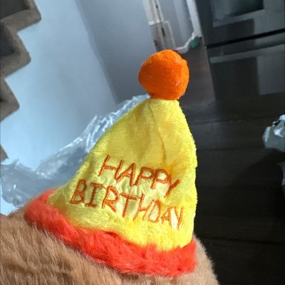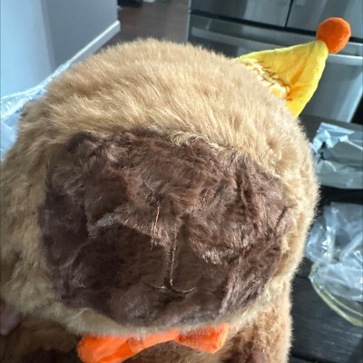 I just opened it and the stitching on the nose is coming out, and there is like some sort of film on the happy birthday on the hat. It also feels like there is very little stuffing in it.