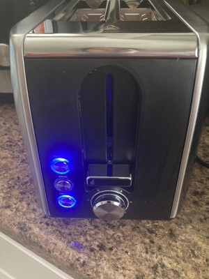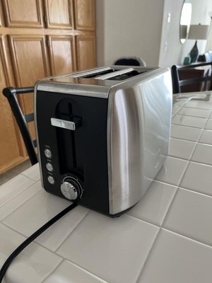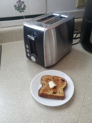[This review was collected as part of a promotion.] This two slice toaster is super easy to use. I love that it’s stainless steel and black like the rest of my appliances. I love that there’s a bagel button and frozen button. Although the bagel button kinda cooks it weird and the smell of plastic is strong for the first few uses. So I have it a 4. I would still recommend.