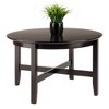 Constructed of Solid Wood, the Toby Coffee Table fits handsomely with either modern or more traditional decor. Its round tabletop is the perfect, inclusive centerpiece around which to gather friends and family. At 30" in diameter, the table has a compact footprint, while offering plenty of space to accommodate books, magazines, and television remotes, or for serving snacks and hors d'oeuvres when company arrives. The shaker-style legs give this table a simple yet elegant profile, and the “X” design under the table top provides extra support while maintaining clean, classic lines. Finished in a rich Espresso. Coordinate your living area with the Toby Accent Table. Easy to assemble.